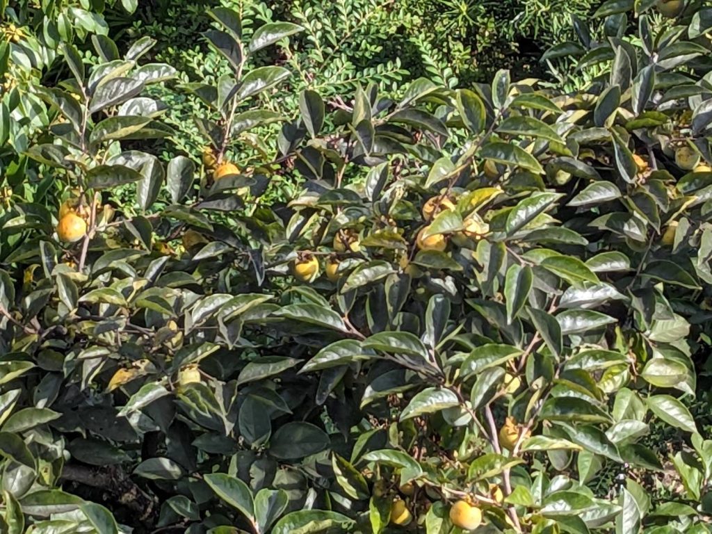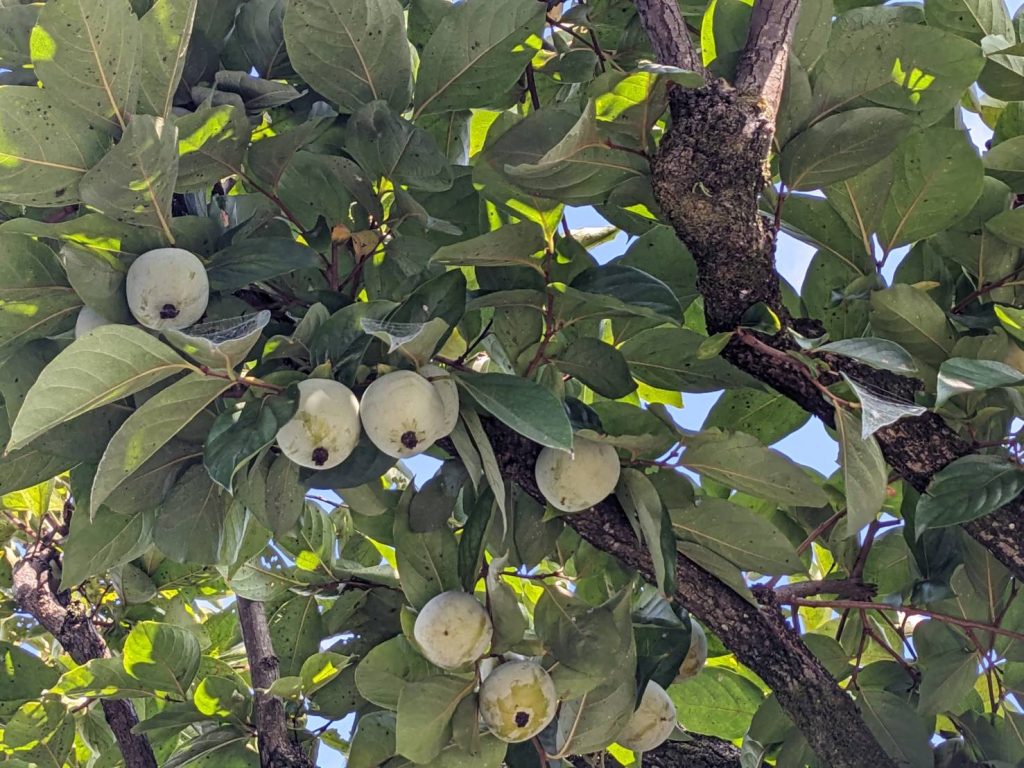上から見ていたら、そろそろ取らなければカラスにやられる!と取りかけましたが、下(裏)から見上げるとまだ緑。