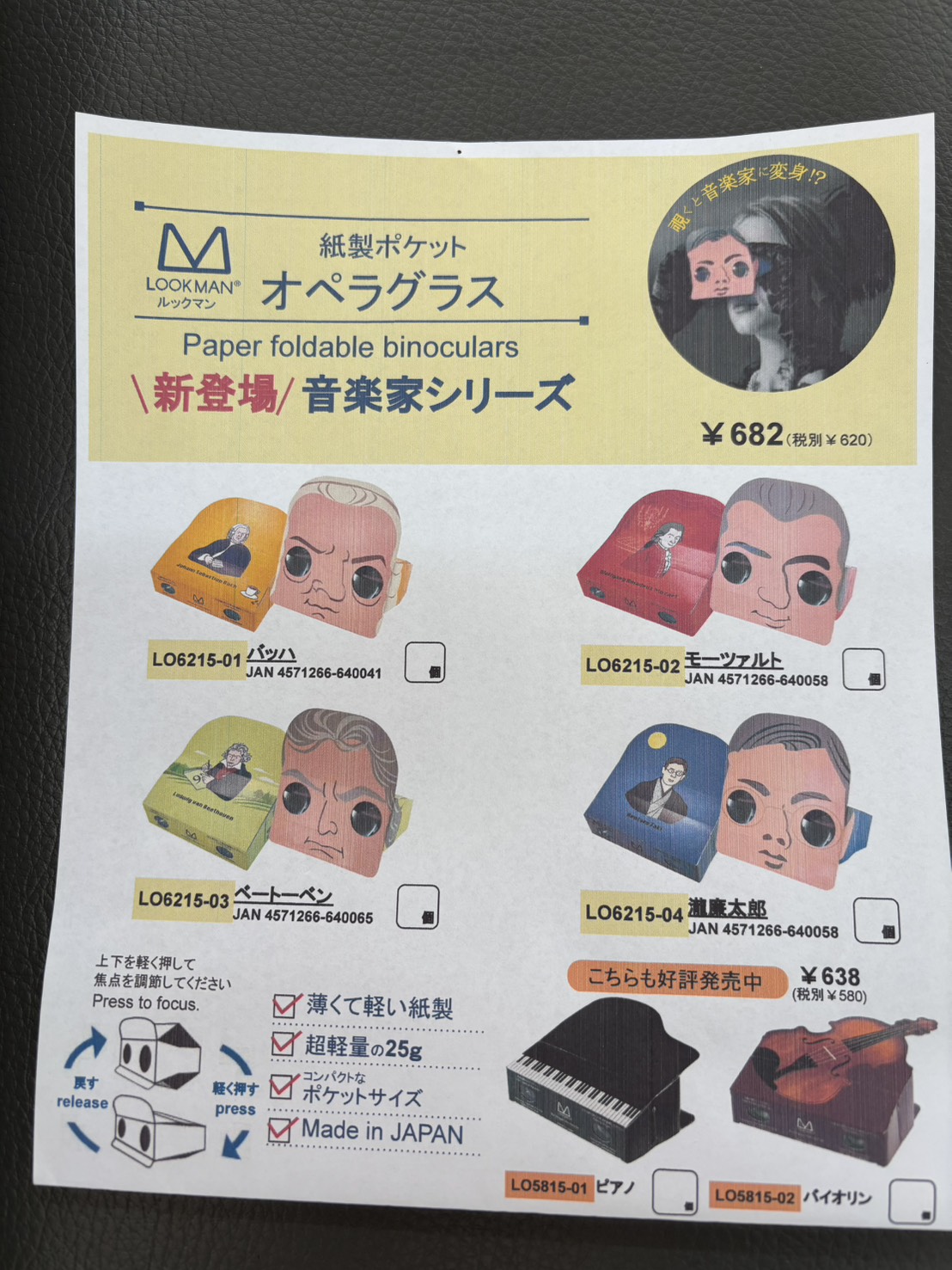 紙でできたオペラグラスで、有名な音楽家の顔になっています。